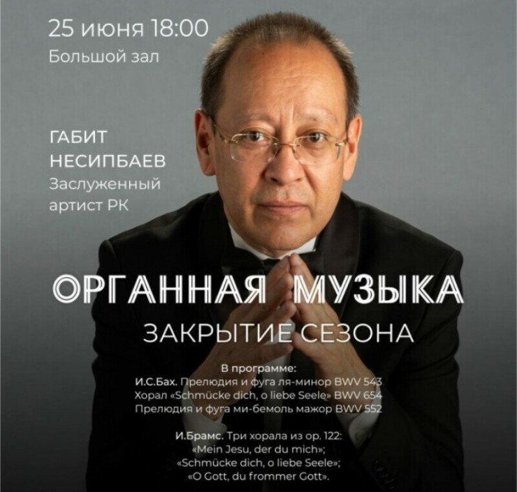 В честь закрытия сезона в Большом зале филармонии имени Жамбыла пройдет концерт органной музыки. Заслуженный артист Габит Несипбаев исполнит лучшие произведения Баха, Брамса, Франка и Мендельсона-Бартольди.