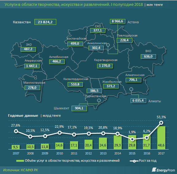 Наибольший объем развлекательных услуг пришелся на Астану: почти 9 миллиардов тенге - на 30,8 процента больше, чем годом ранее (37,6 процента от РК). В культурной столице, Алматы, услуги в сфере креатива и развлечений составили более 6 миллиардов тенге - на 21,1 процента больше, чем год назад (25,3 процента от РК). На третьем месте среди регионов - Атырауская область (6,1 процента от РК, 1,45 миллиарда тенге: годовой рост сразу в 2,4 раза).