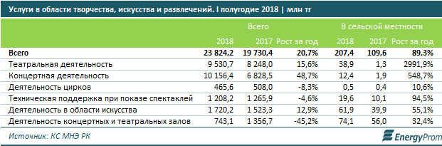 Общий объем креативно-развлекательных услуг составил 24 миллиарда тенге за полугодие. Более 80 процентов всех услуг относятся к концертной (42,6 процента) и театральной (40 процентов) деятельности, в то время как услуги цирков составили лишь 2 процента.