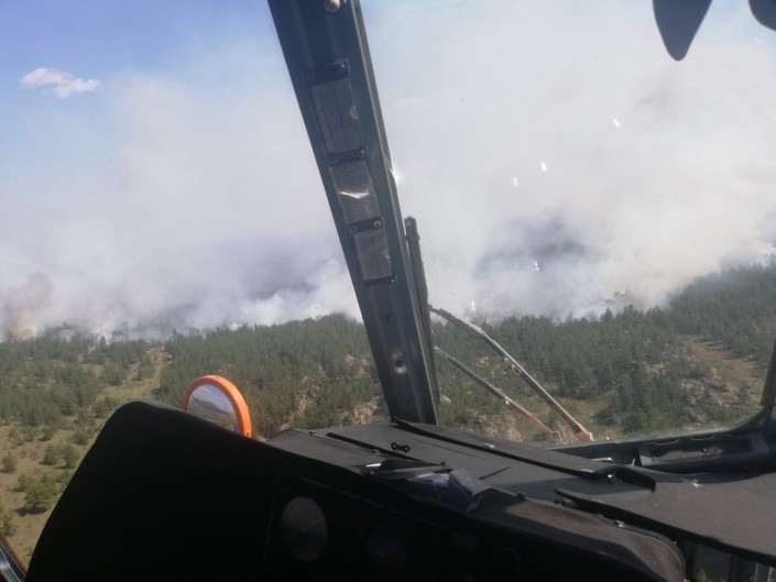 "На территории государственного лесного фонда огонь распространился на 1500 гектаров. Покрытая лесом площадь - 700 гектаров, из них верховым (огнем - прим. автора) охвачено 300 гектаров. Сильная задымленность. Вид пожара - верховой и низовой, устойчивый", - сообщили в пресс-службе Министерства экологии, геологии и природных ресурсов.