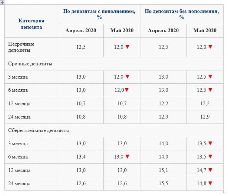 Ставки по долгосрочным вкладам на май 2020 года не изменились, за исключением сберегательных депозитов без пополнения, которые снизились до 14,7 процента и 14,8 процента. При этом они остаются привлекательными на фоне пересмотренных ставок по краткосрочным депозитам и обеспечивают высокую доходность", - отметили в КФГД.