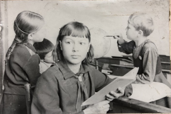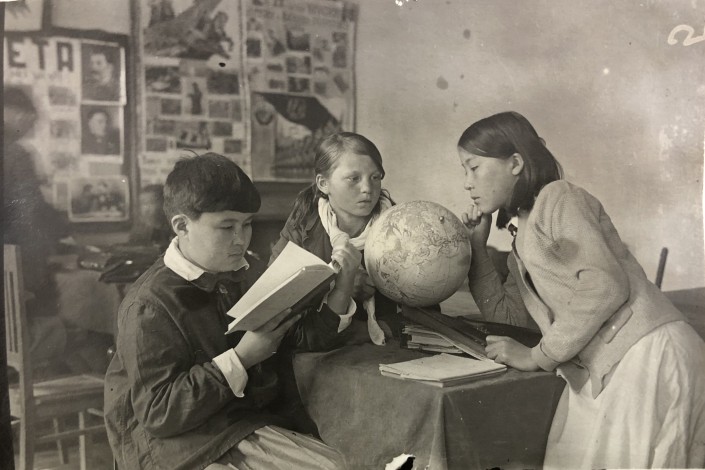 Алма-Ата. 1938 год. Три ученика школы № 12 имени Кирова на перемене. Одна увлечена чтением, две другие заняты изучением глобуса. Школьной формы как таковой нет. Но можно заметить общий стиль в одежде. На девочках однотонные платьица, кофточки на пуговицах, верхняя рубашка.