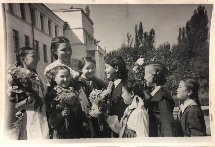 1960 год. Первоклассники школы № 28 Алма-Аты дарят цветы выпускникам. Здесь можно заметить, что изменилось "плечо" передника у ученицы младших классов. Похоже, что в этот период вошли в моду фартуки с широкими лямками в виде воланов. У парней-десятиклассников строгие классические пиджаки и галстуки.