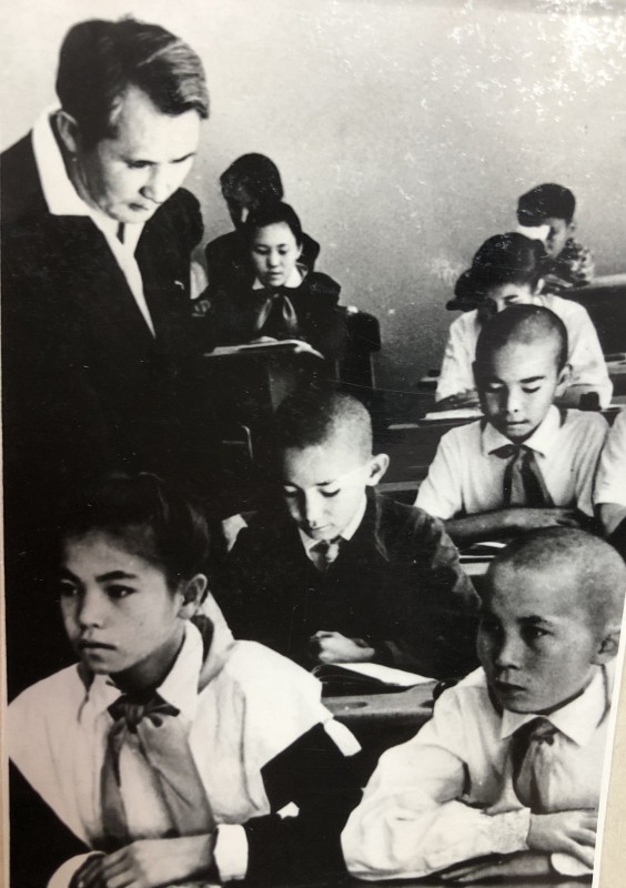 Урок арифметики в меркенской средней школе. На девочке - пионерский галстук и платье с цветочным узором.