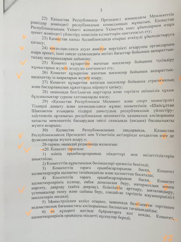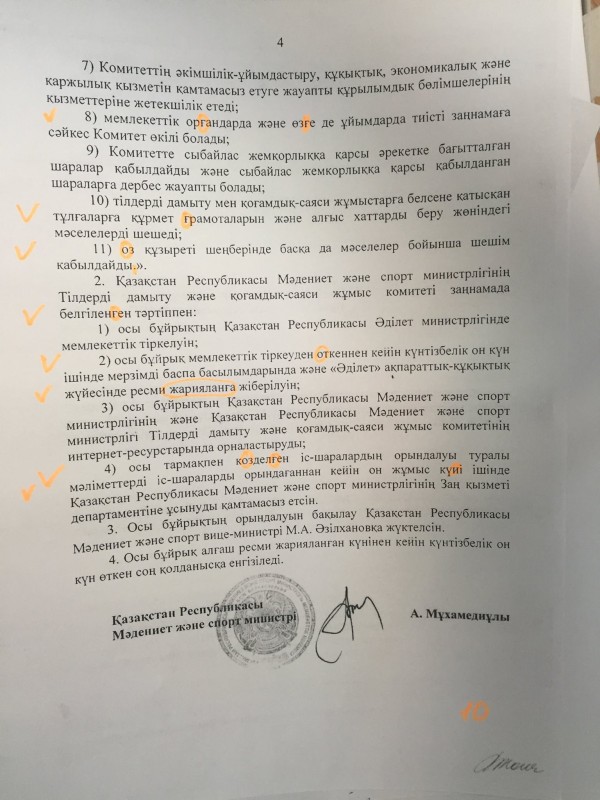 Отметим, что приказ с ошибками министра культуры и спорта РК "О внесении изменений в приказ министра культуры и спорта Республики Казахстан от 14 октября 2014 года №36 "Об утверждении Положения государственного учреждения "Комитет по развитию языков и общественно-политической работы Министерства культуры и спорта Республики Казахстан" от 18 мая 2015 года на казахском языке был официально опубликован 28 июля 2015 года. На четырех страницах документа пользователи Казнета насчитали около 50 орфографических ошибок и опечаток.