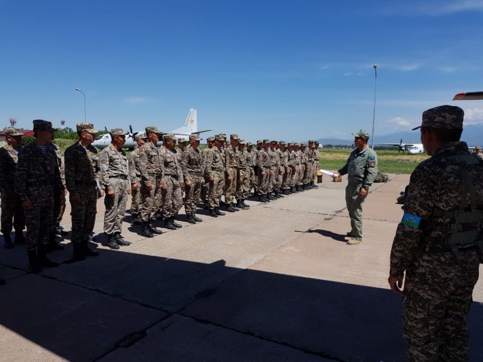 Командующий Десантно-штурмовыми войсками СВ ВС РК генерал-майор Каныш Абубакиров провел строевой смотр и инструктаж личного состава, убывающего в Арысь для выполнения поставленных задач.