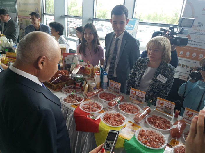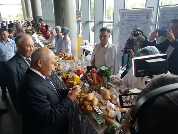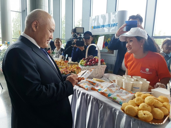 В холле киноконцертного зала расположилась сельскохозяйственная выставка. Производители из разных регионов страны представляли свою продукцию заместителю премьер-министра - министру сельского хозяйства Умирзаку Шукееву и даже предлагали ее попробовать.