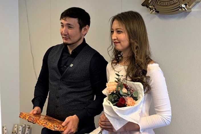 Как сообщается на странице посольства в Facebook, молодоженами являются докторант Юго-восточного университета Норвегии Елжас Жаксылык и магистрант Университета Gijon в Испании Асель Елюбаева. Пара познакомилась в период обучения по программе бакалавриата в КБТУ в Алматы. Чтобы разделить радостное событие, из Казахстана в Осло приехали друзья молодоженов, которые выступили свидетелями государственной регистрации заключения брака.