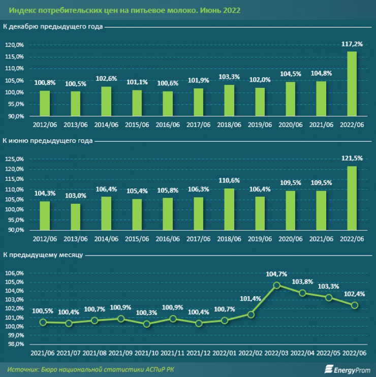 Цена на молоко по итогам июня выросла на 2,4 процента, а с начала года - сразу на 17,2 процента. По сравнению с прошлым годом цена на молоко выросла на 21,5 процента.