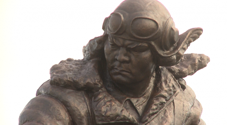 Изначально памятник был отлит из чугуна. Он стал одним из символов Караганды и стоял на одноименной улице с 1958 года. Несколько лет назад неожиданно отвалилась часть штурвала в руках у легендарного летчика. Памятник обследовали специалисты и выдали неутешительный результат: монумент покрылся глубокими трещинами, заделать которые невозможно. За 60 лет чугун стал разрушаться от карагандинских перепадов температур. Власти города решили сделать бронзовую копию памятника.