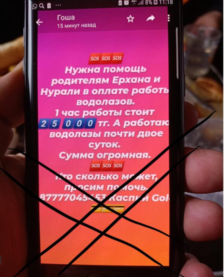 Пользователи социальных сетей и мессенджеров распространяют информацию о сборе средств. Согласно рассылке, за 1 час работы водолазов необходимо заплатить 25 тысяч тенге. Мошенники утверждают, что родители пропавших школьников должны заплатить огромную сумму.