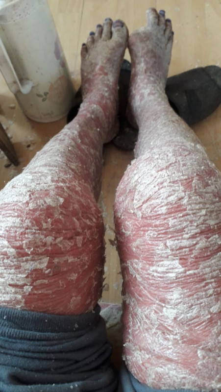 После обострения болезни пациент обращался во множество медицинских учреждений, но лечение не принесло положительного результата. Аскарбеку сейчас сложно двигаться и ходить: чешуйки пересохшей кожи трутся друг о друга и опадают, причиняя мужчине боль.