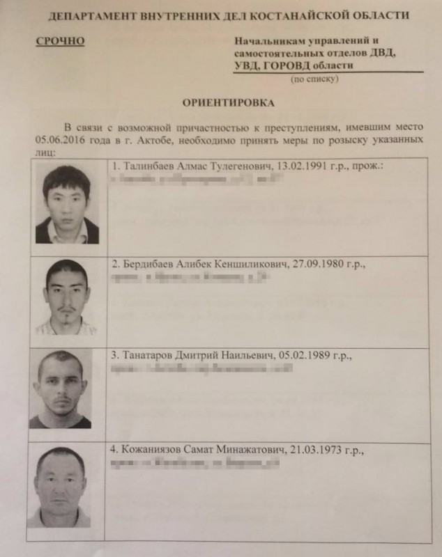 В МВД РК прокомментировали распространенные в социальных сетях и мессенджерах ориентировок, разыскиваемых в Актобе, передает корреспондент Tengrinews.kz. 5 июня в Актобе произошел теракт.