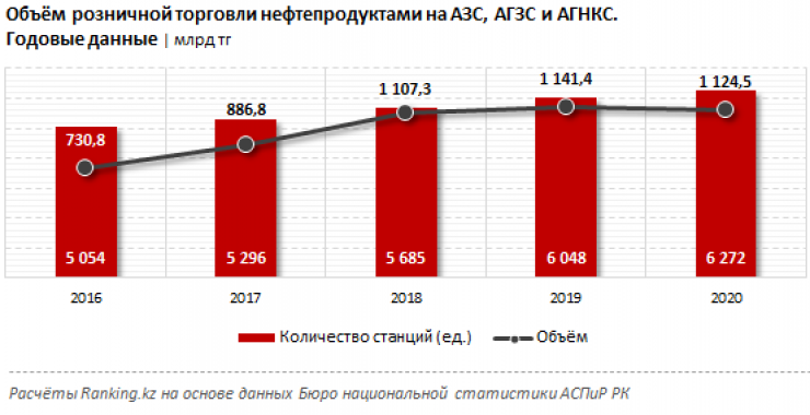 Объем розничной торговли нефтепродуктами автозаправочными (АЗС), автогазозаправочными (АГЗС) и автогазонаполнительными компрессорными (АГНКС) станциями в 2020 году составил 1,1 триллиона тенге - лишь на 1,5 процента меньше по сравнению с 2019-м.