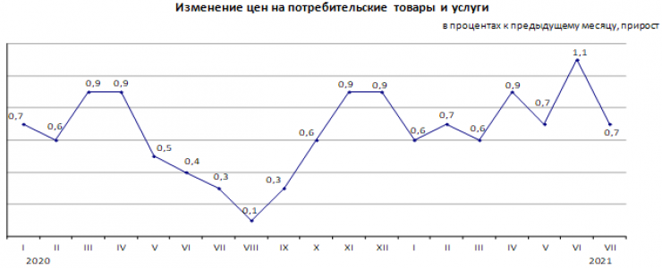 Сообщается, что за июль 2021 года в сравнении с июнем цены на продовольственные товары повысились на 0,7 процента, непродовольственные - на 0,5 процента, платные услуги - на 0,8 процента.