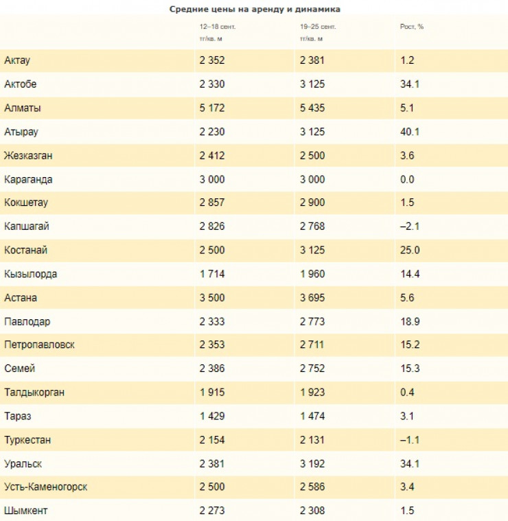 В Актобе и Уральске за неделю (19-25 сентября) против прошлой недели (с 12 по 18 сентября) аренда подорожала в среднем на 34 процента, в Костанае - на 25 процентов, в Павлодаре - на 19 процентов, в Семее и Петропавловске примерно на 15 процентов.