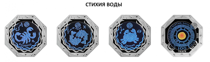 Монеты изготовлены в 12 видах, соответствующих каждому знаку зодиака - "Овен", "Лев", "Стрелец", "Телец", "Дева", "Козерог", "Водолей", "Близнецы", "Весы", "Рыбы", "Рак" и "Скорпион". Дизайн монет выполнен в стилистике наскальной живописи. Каждый цвет танталовой вставки на монете соответствует цвету стихии. Монеты изготовлены из серебра и тантала с применением технологии изменения цвета.