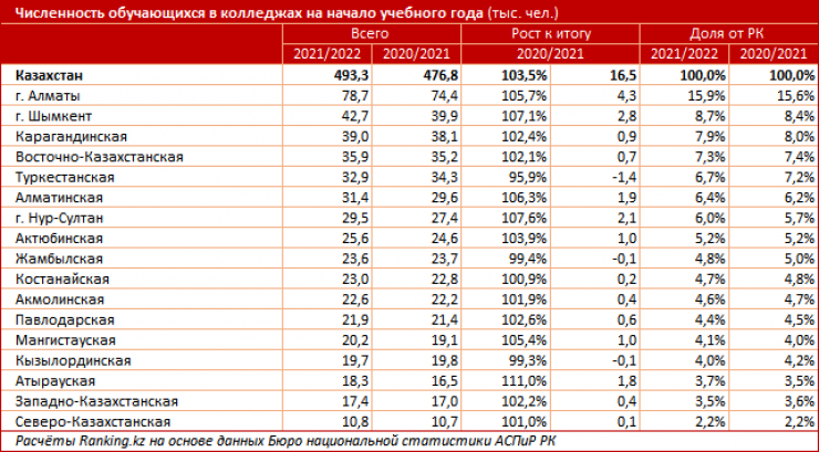 На начало 2021 учебного года в стране насчитывалось 724 колледжа. Из них 719 очных и 287 заочных отделений. Число обучающихся в колледжах в этом году выросло на 3,5 процента до 493,3 тысячи человек. Среди регионов больше всего учеников колледжей обучается в Алматы, Шымкенте и Карагандинской области. В этом году в колледжи поступило 176,7 тысячи студентов.
