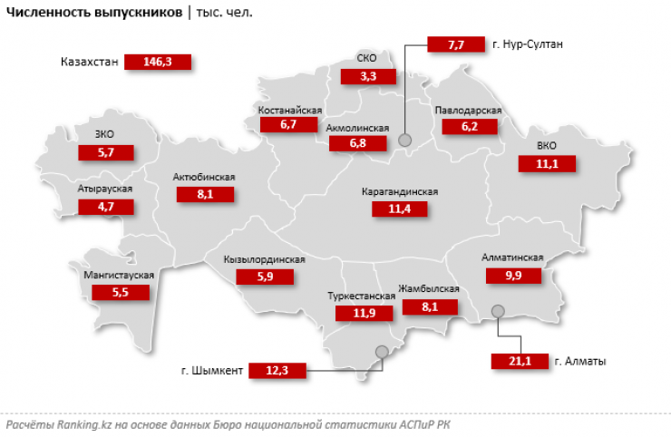 Среди допущенных к экзаменам лидирует Алматы: 21,1 тысячи студентов. Далее идут Шымкент (12,3 тысячи студентов) и Туркестанская область (11,8 тысячи студентов).