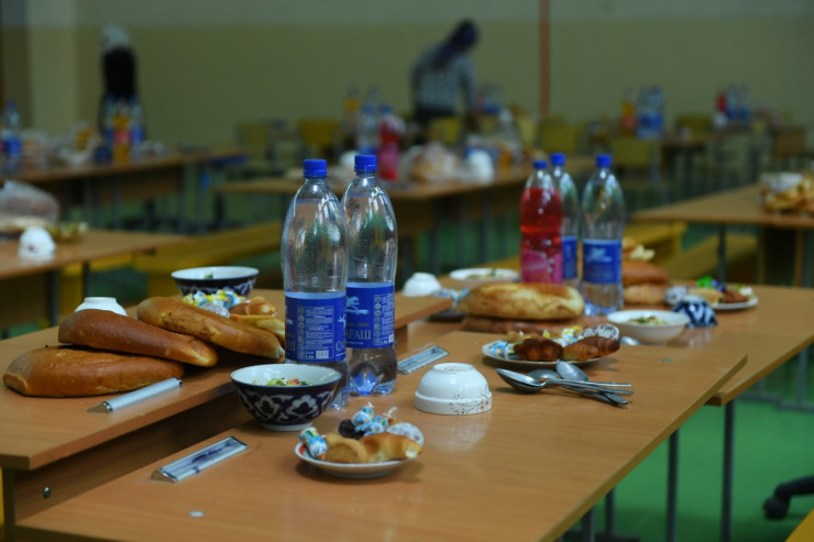 Такая же ситуация и в другой школе поселка Атакент. Кухню для приготовления пищи развернули прямо на улице. Варят пищу на открытом огне.