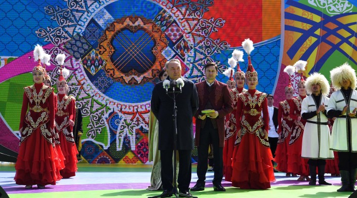 "Никто не виноват, что в истории мы стали таким многонациональным государством. Мы тоже не виноваты, это - история, жизнь. Поэтому, мы продолжаем до сих пор заботиться о других народах. У каждого свой танец, свое искусство, язык свой. Разве это не прекрасно, когда все это объединяется в одно целое. Поэтому, мы должны считать, что мы - счастливый народ", - заявил Первый Президент.