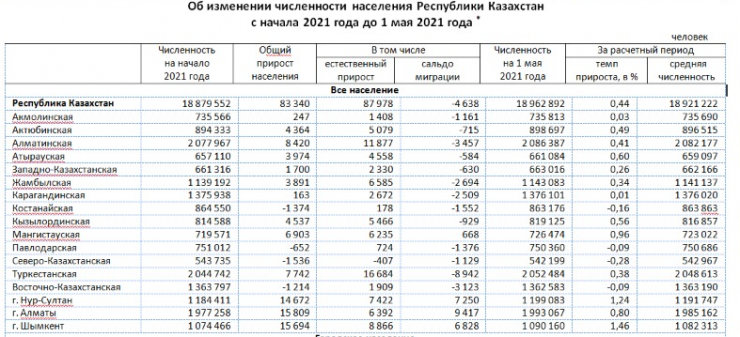 В Северо-Казахстанской области количество умерших превышает количество родившихся на 407 человек (единственный регион с отрицательным показателем в графе "Естественный прирост населения"). В целом численность населения СКО уменьшилась на 1 536 человек за четыре месяца 2021 года.