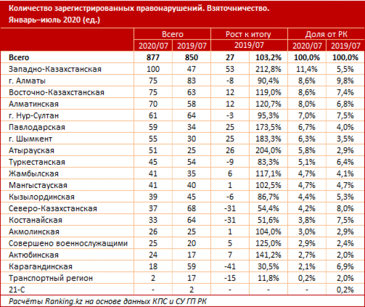 По итогам семи месяцев наибольшее количество правонарушений в сфере взяточничества пришлось на Западно-Казахстанскую область - 100 случаев, это в 2,1 раза больше, чем годом ранее. В тройку печального первенства также вошли Алматы и Восточно-Казахстанская область: по 75 зарегистрированных правонарушений в каждом из регионов.