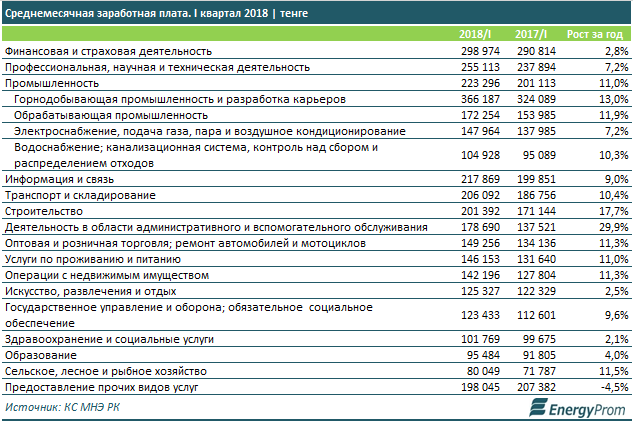 По итогам первого квартала 2018 года среднемесячная заработная плата казахстанцев составила 152,4 тысячи тенге - на 8,7 процента больше, чем в аналогичном периоде прошлого года, сообщается в исследовании Energyprom.kz.