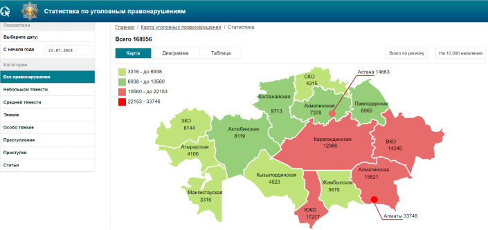 По данным Карты правонарушений, опубликованной на сайте Комитета по правовой статистике и специальным учетам Генеральной прокуратуры, наиболее опасными регионами признаны Алматинская, Восточно-Казахстанская, Карагандинская, Южно-Казахстанская области и Астана, а Алматы признан самым криминогенным.