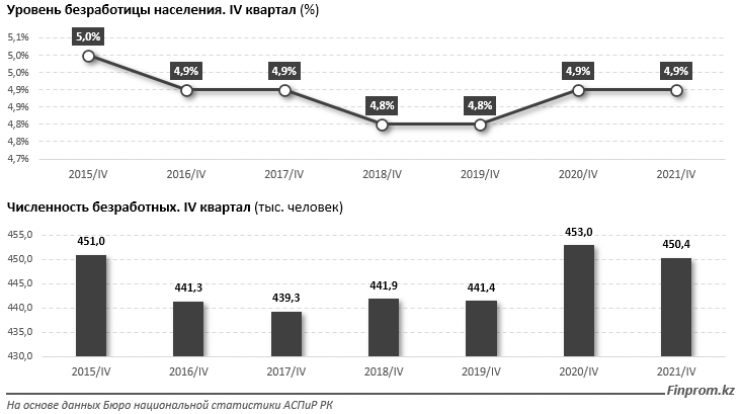 Уровень безработицы в Казахстане второй год остается без изменений. В конце 2021 года он составил 4,9 процента, передает корреспондент Tengrinews.kz со ссылкой на Finprom.kz.