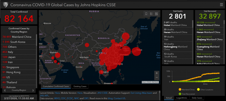 По актуальным данным, в мире более 82 тысяч человек заражены коронавирусной инфекцией. Число жертв COVID-19 достигло 2801 человека, более 32 тысяч человек полностью излечились после заражения.