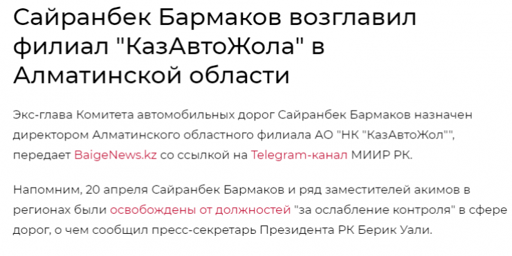 Через несколько дней, 23 апреля, в СМИ появилась информация о назначении Сайранбека Бармакова на должность директора алматинского филиала нацкомпании "КазАвтоЖол". Издания, в том числе государственные, в своих публикациях ссылались на официальное сообщение Министерства индустрии и инфраструктурного развития. На данный момент публикации о назначении Бармакова на должность в "КазАвтоЖоле" в Telegram-канале министерства нет.