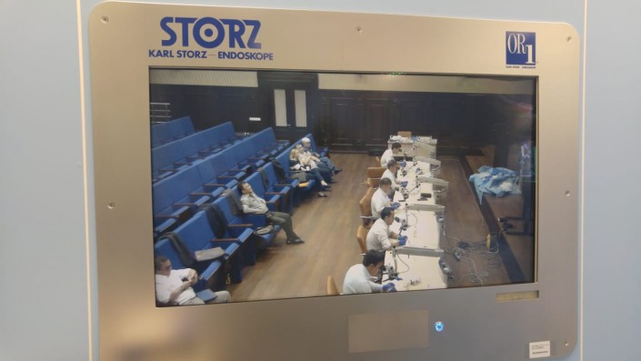 Иностранные коллеги наблюдают за ходом операции на большом экране, сидя в конференц-зале. Оперирующий врач комментирует все действия по громкой связи.