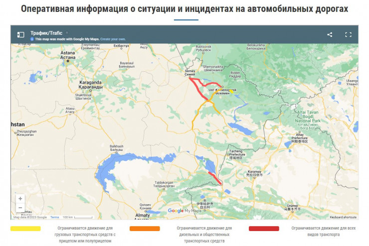 Сообщается, что в области Абай для грузовых транспортных средств с прицепом и полуприцепом движение ограничено на автодорогах Омск - Майкапчагай от села Калбатау до села Кокпекты и Алматы - Усть-Каменогорск от Аягоза до села Калбатау.