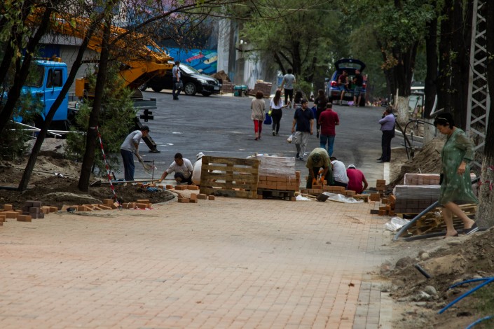 Укладка брусчатки по проспекту Абая. Фото Андрея Зайцева