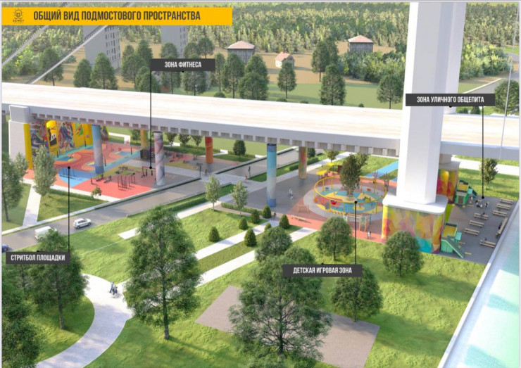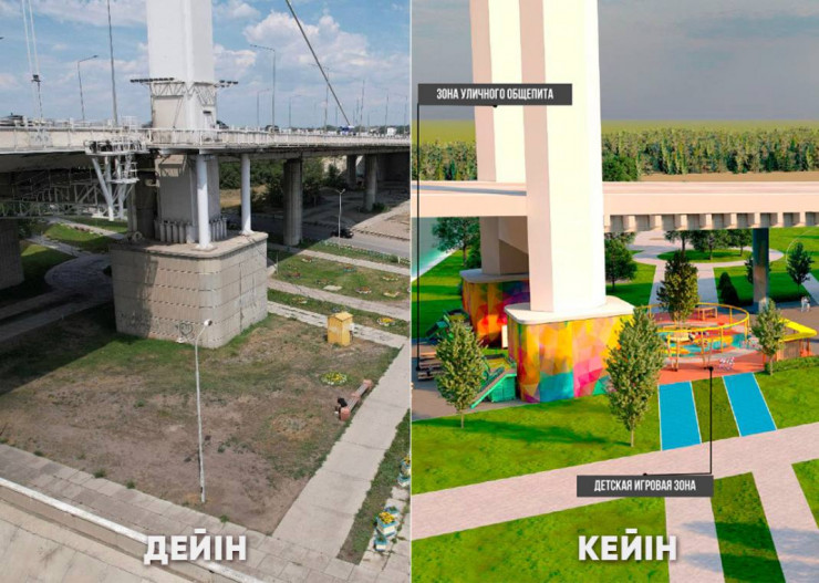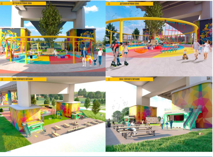 "Подмостовое пространство разделят на зоны: спортивную и детскую игровую. В спортивной зоне будут стритбольная площадка, зона для занятия уличным фитнесом и кроссфитом. Также планируется соорудить скейт-парк и паркур-площадку в активной зоне для подростков. Для детей помладше запланировано установить детские игровые комплексы, качели, балансиры и мини-скалодромы", - отметили в пресс-службе акимата Абайской области.