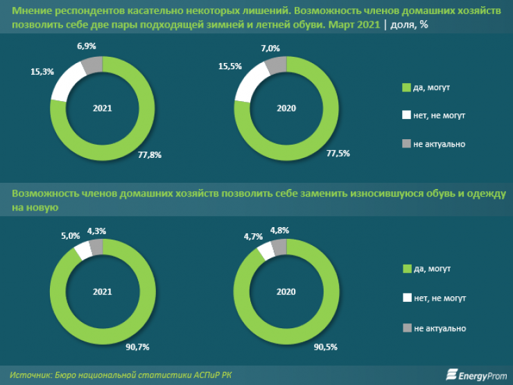 В то же время увеличилась и доля казахстанцев, которые могут позволить себе обновку (с 90,5 процента до 90,7 процента); доля тех, для кого вопрос не актуален, уменьшилась с 4,8 процента до 4,3 процента.