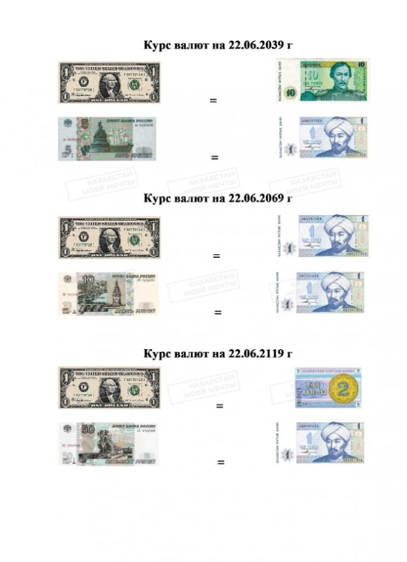 На рисунке изображены курсы валют 22 июня в 2039, 2069 и 2119 годах. По замыслу автора, в 2039 году доллар будет стоить 10 тенге. В 2069 казахстанская валюта укрепится еще больше и курс составит 1 тенге за доллар. А в 2119 доллар будет стоить два тиына.