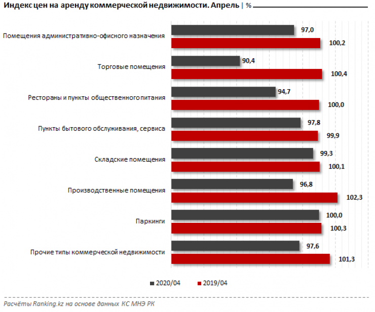 В апреле 2020 года цена на аренду коммерческой недвижимости упала на 5,1 процента по сравнению с мартом 2020 года и на 4,8 процента по сравнению с апрелем 2019 года, передает Tengrinews.kz со ссылкой на Ranking.kz.