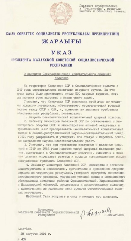 Пресс-служба Первого Президента опубликовала в соцсетях указ Нурсултана Назарбаева о закрытии Семипалатинского испытательного ядерного полигона, передает Tengrinews.kz.