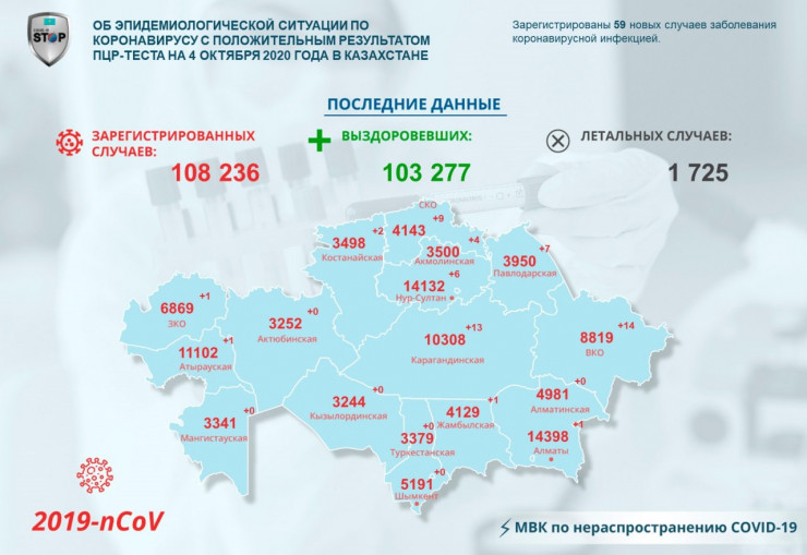 За прошедшие сутки (по данным на 4 октября) в Казахстане зарегистрированы 59 новых случаев заболевания коронавирусной инфекцией, сообщает Tengrinews.kz со ссылкой на МВК по нераспространению COVID-19.