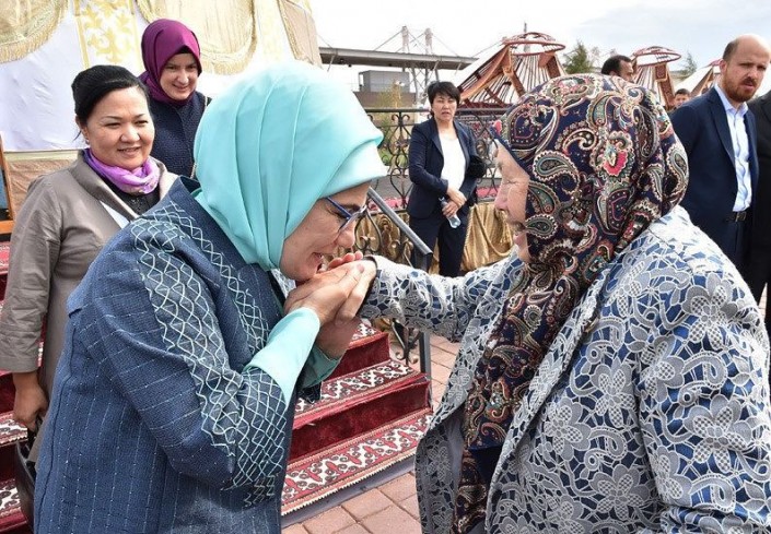Наибольшую популярность получил снимок, на котором первая леди Турции целует руку простой казахской бабушке.