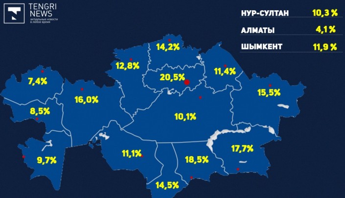 В разрезе регионов ситуация с явкой складывается так: Акмолинская область - 20,5 процента, Актюбинская - 16, Алматинская - 17,7, Атырауская область - 8,5, Восточно-Казахстанская - 15,5, Жамбылская - 18,5, Западно-Казахстанская - 7,4, Карагандинская - 10,1, Кызылординская - 11,1, Костанайская - 12,8, Мангистауская - 9,7 , Павлодарская - 11,4 , Северо-Казахстанская - 14,2, Туркестанская - 14,5, Нур-Султан - 10,3 , Алматы - 4,1, Шымкент - 11,9 процента.