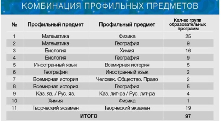 "При совпадении комбинаций профильных предметов предоставляется возможность выбора до четырех групп образовательных программ, - сообщили в Департаменте высшего и послевузовского образования МОН РК. – Так, с комбинацией профильных предметов "Биология" + "Химия" можно выбрать группы образовательных программ "Подготовка учителей химии", "Биологические и смежные науки", "Ветеринария", "Общая медицина". Перечень групп образовательных программ опубликован на сайте НЦТ. Абитуриенты, ставшие обладателями гранта, при зачислении в вуз выбирают конкретную образовательную программу из соответствующей группы образовательных программ. Так, абитуриент, ставший обладателем гранта по группе образовательных программ "Подготовка учителей химии", при зачислении в вуз может выбрать образовательную программу "Химия" или "Химия-Биология".