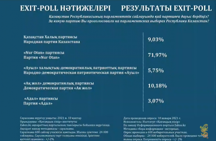 По данным другого exit poll - от исследовательского института "Қоғамдық пікір", результаты расположились следующим образом:
