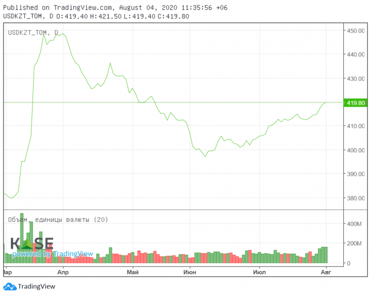 По данным Нацбанка, курс на сегодня, 4 августа, составил 420,07 тенге за доллар. Падение за неделю составило почти 6 тенге.