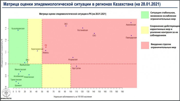 По последним данным, в "красной" зоне по эпидемиологической ситуации находятся Нур-Султан, Алматы, Акмолинская, Атырауская, Западно-Казахстанская, Костанайская, Павлодарская и Северо-Казахстанская области. В "желтой" зоне - Карагандинская область. В "зеленой" зоне - все остальные регионы.