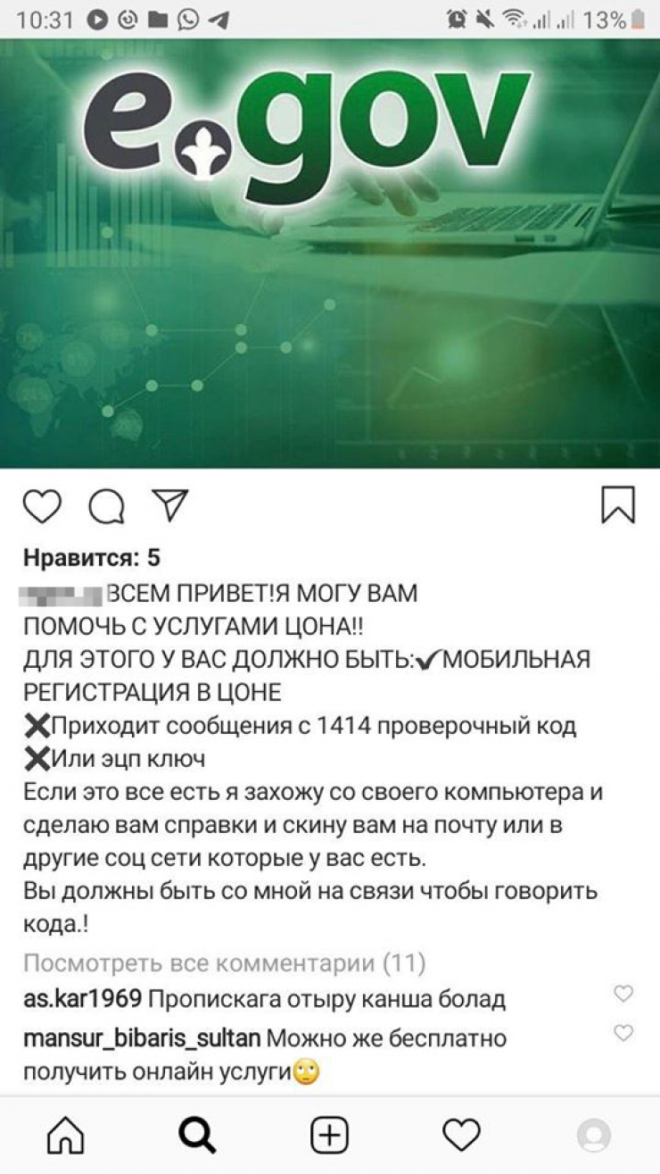 В социальных сетях распространяются объявления о помощи в оформлении электронной цифровой подписи (ЭЦП), пособий во время чрезвычайного положения в Казахстане и других государственных услуг за деньги.