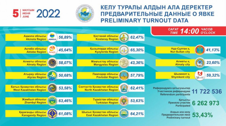 В Центральной избирательной комиссии Казахстана заявили о преодолении обязательного порога явки на референдум, передает корреспондент Tengrinews.kz.