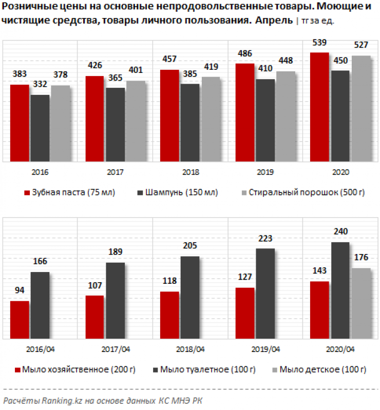 Розничные цены на моющие и чистящие средства, а также товары личного пользования выросли за год на 7,7–17,6 процента, передает корреспондент Tengrinews.kz со ссылкой на Ranking.kz.